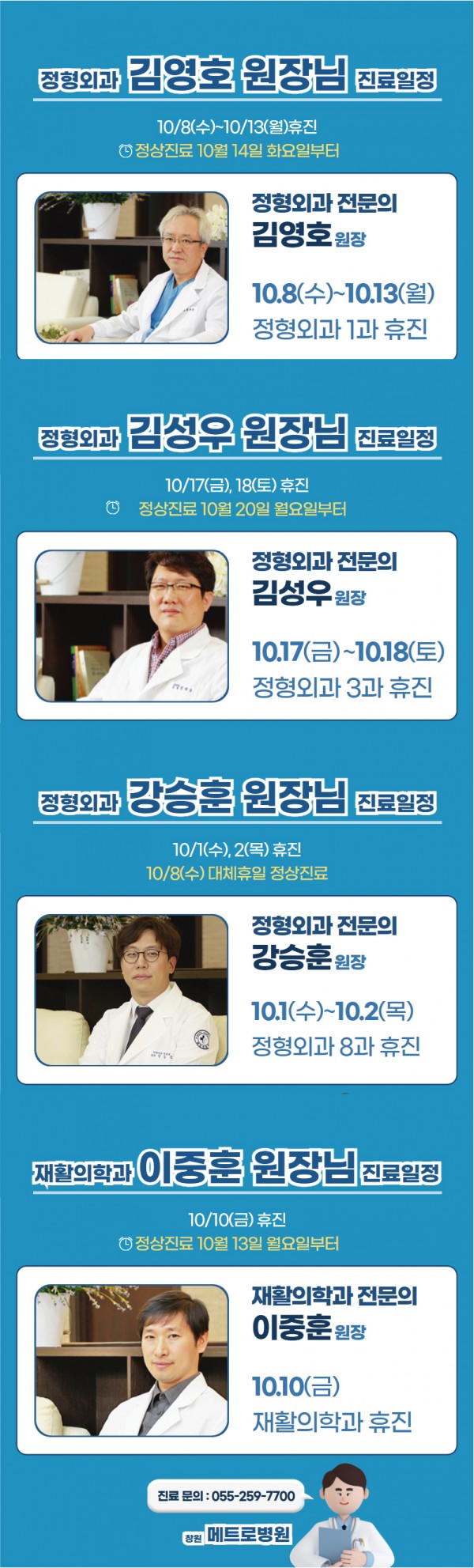 창원 메트로병원 정형외과, 재활의학과 10월 진료 일정 안내