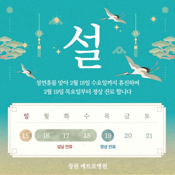 창원 메트로병원의 2026년 2월 설연휴 휴진일을 안내 드립니다.