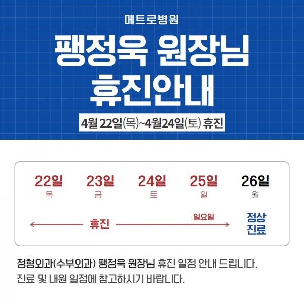 정형외과 팽정욱 원장님 휴진일(04.22~04.26) 안내